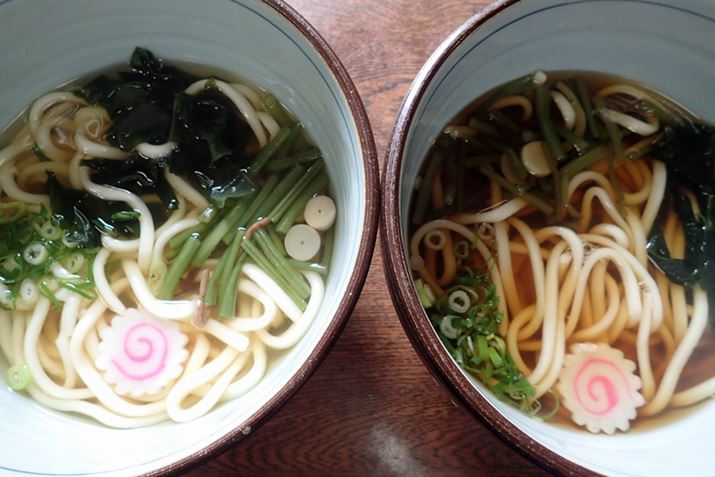 せっかくなので、東西両方のうどんをオーダーしてみた。見るからに出汁の色が違う。関東風(右)は少し甘め、関西風(左)は出汁の風味がしっかりしていてどちらも甲乙つけがたい