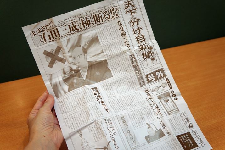 破れないように包みを開いてみると、本当に新聞だった! 「天下分け目新聞」には三成の柿エピソードをはじめ、関ヶ原の戦いをパロディ化した記事が満載だ。尋ね人に「島左近」を入れていたり、戦国ファッションコーナーで兜の飾りなどを紹介するといった遊び心とセンスにニヤニヤしてしまう
