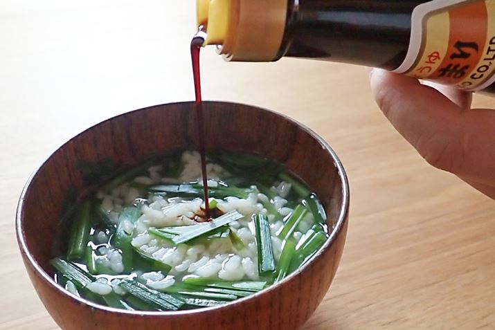 三成が好んでいたというニラ雑炊にも、「関ヶ原たまり」を数滴。これまた、あまりのうまさに箸が止まらない。この味なら、健康オタクの三成も食べすぎたであろう