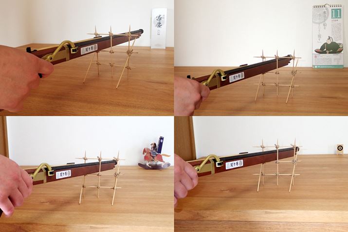 的を変えて、バンバン撃ってみた(家康が多めなのは、西軍びいきゆえ仕方ない)。6連射なので、結構当たりやすい。また、馬防柵で先端が固定されるのも撃ちやすさに貢献してくれた