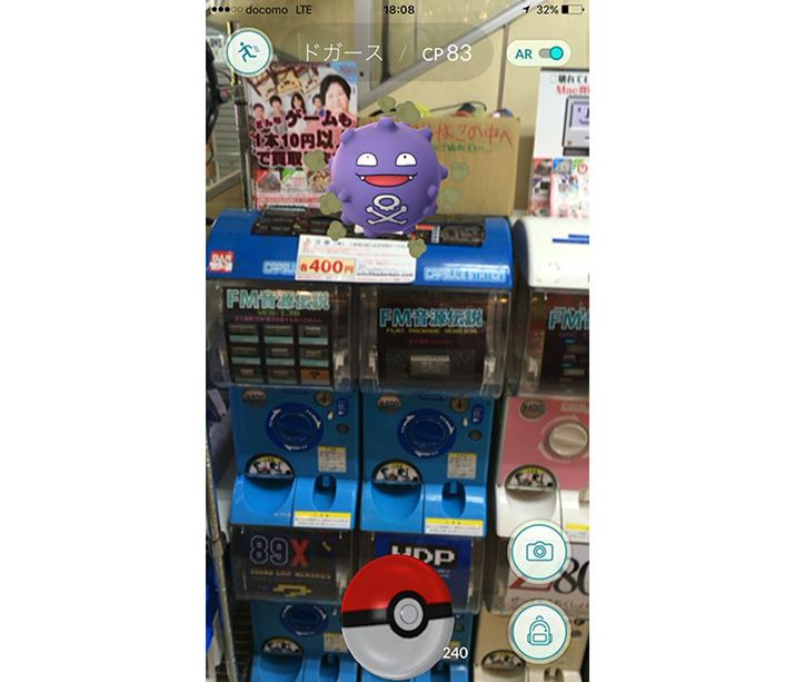 AR機能をオンにすると実際の背景の上にポケモンが映し出される。写真は、秋葉原にあるラジオデパート1階「家電のケンちゃん」というお店に設置された、ガチャガチャに出現した「ドガース」。AR機能を使えば「ガチャガチャからポケモンが!」といったような雰囲気も楽しめてしまう