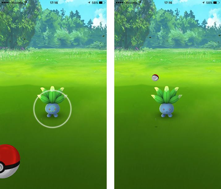 ポケモンの捕まえ方は、地図上に現れたポケモンをタップして、モンスターボールを投げて捕まえることとなる。このときにAR(仮想現実)機能で、現実の世界と重なり、リアルな世界にポケモン達が登場するというのが面白い。このAR機能はポケモンGOの醍醐味のひとつだが、スマートフォン本体を動かしてポケモンを画面中央に表示させる必要があり、うまくボールをぶつけるには、それなりの熟練度を要する。