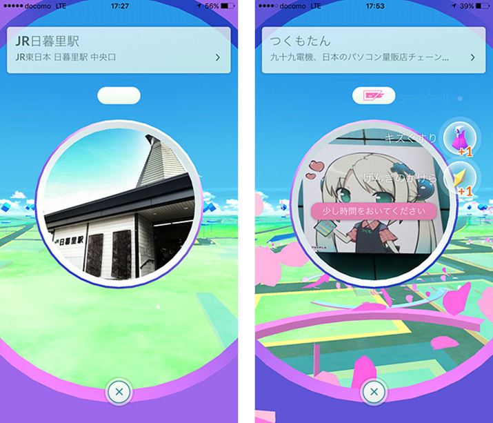 マップ上のポケストップは、その付近に近づきタップすると詳細が表示される。中央付近を左右にスワイプするとモンスターボールなどが出現。それらをタップしたりスワイプしたりすると回収できるが、そのまま×ボタンをタップしても取ったことになる仕様だ。なお、持ち物がいっぱいのときはその旨が表示されて何も取れないが、経験値はもらえる。ポケストップ自体は、史跡や名所、ランドマークといった場所に設定されているので、訪れてみれば「地元なのにこんな名所があるなんて知らなかった」といった、新たな発見につながることもあるだろう。後述するアイテムの「ルアーモジュール」を使用すると、ポケストップに花びらが舞い散ったエフェクトが追加される。このときはポケモンの出現率が上がるので、見かけたら積極的に近づいてみよう。