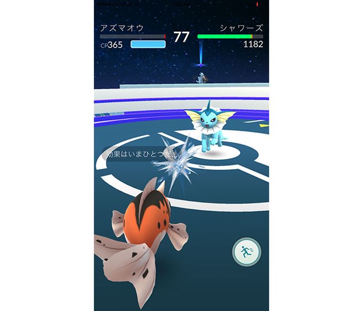相手の攻撃をフリック操作で避けて、タイミングを見計らい自分のポケモンをタップしてアタック! とはいえ、CP差がありすぎると一撃で倒されてしまうこともある。ジムバトルは強者との戦いなのだ