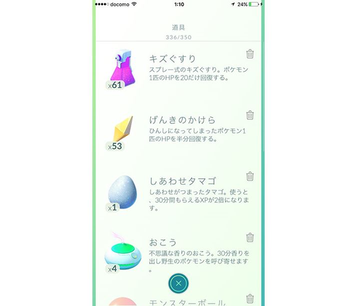 ここで、アイテムについて解説しておこう。「キズぐすり」はポケモン1匹のHPを20ポイント、「いいキズぐすり」は同じく50ポイント回復させる。瀕死になってしまったポケモンは、「げんきのかけら」を使うことで半分までHPが回復する。ジムでライバルチームのポケモンと対戦して負けた場合は、げんきのかけらが必要だ。「しあわせたまご」は、使うことで30分の間、もらえる経験値が2倍になる。「おこう」は、香りを出し野生のポケモンを呼び寄せるが、こちらも30分の期限付き。実際におこうを使った感覚としては、通常よりも若干出現率が多いかな?という程度だった。モンスターボールは、ポケモンを捕まえる際に必要となる必須アイテム。レベルが上がると、よりポケモンを捕まえやすくなる「スーパーボール」が入手できる。