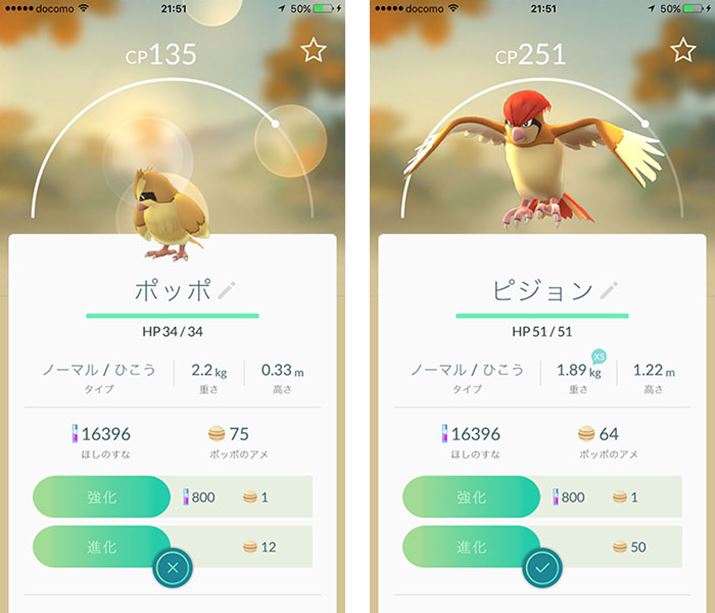 「ポッポ」は、「ポッポのアメ」を12個集めると「ピジョン」に進化する。進化させると、CPやHPが大幅にパワーアップするだけでなく、見た目もまったく別のポケモンになる。経験値も入手できるので、ポケモントレーナーのレベルアップにも最適だ