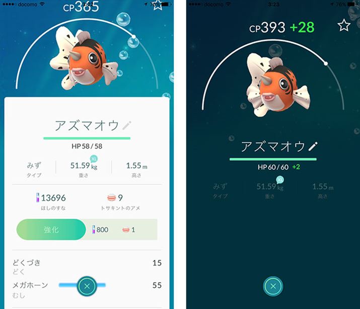 ゲットしたポケモンは、「ほしのすな」と「アメ」を消費して強化させられるほか、一部は進化させることもできる。強化と進化の違いだが、強化は見た目そのままでCPとHPがアップし、進化はアメを消費して見た目も別のポケモンになり、HPとCPが大幅に増える。一般的なソーシャルゲームでは、最初にMAXまで強化させてから進化させるのが王道だが、本作ではいきなり進化させてしまっても問題ない。むしろ、トレーナーのレベルが低いうちは強化で得られるメリットが低いので、積極的に進化させよう。一気に戦力がアップするだけでなく、進化させることで経験値も得られるため、トレーナーのレベルアップにも貢献することになるのだ。