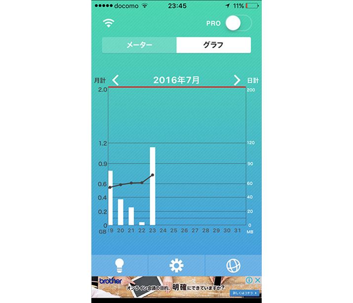 1日のパケット通信量をグラフで表示。23日の棒グラフは、ほぼポケモンGOで消費した。7時間弱歩き回ってプレイしてこの消費量なら、工夫すれば1か月で2GB以内に収められそうだ