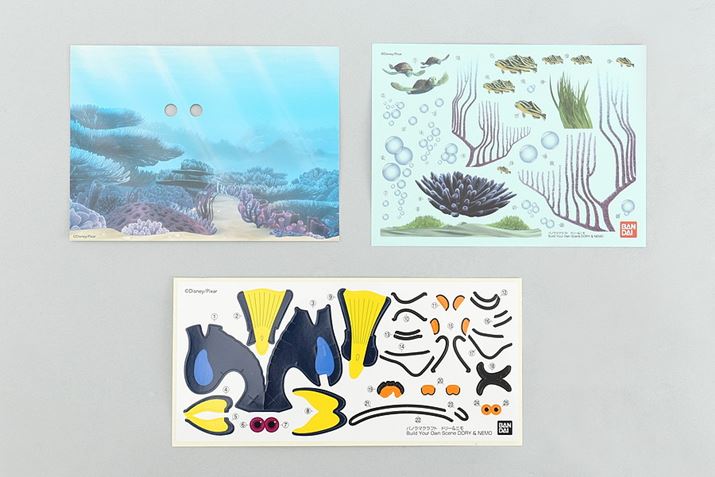 付属品です。海の中を再現する背景台紙、ドリーやニモの色分けや模様を再現するシール、海草などのクリアシールが付属しています