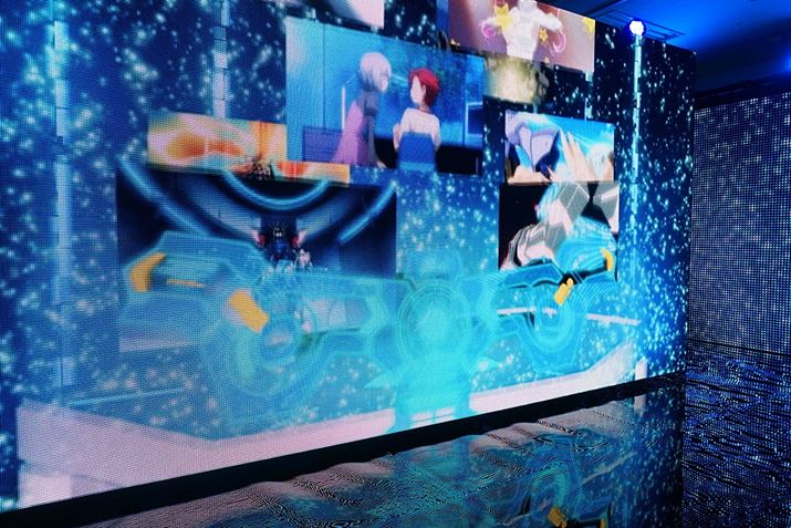 会場内へ入るとまず、「ガンダムビルドファイターズ」シリーズに登場する特殊な粒子「プラフスキー粒子」がLEDで表現された空間が広がります。目の前の大きなモニターと、四方の壁に設置された無数のLEDにより「プラフスキー粒子」が満ちている空間を表現。光や音の迫力がすごい!