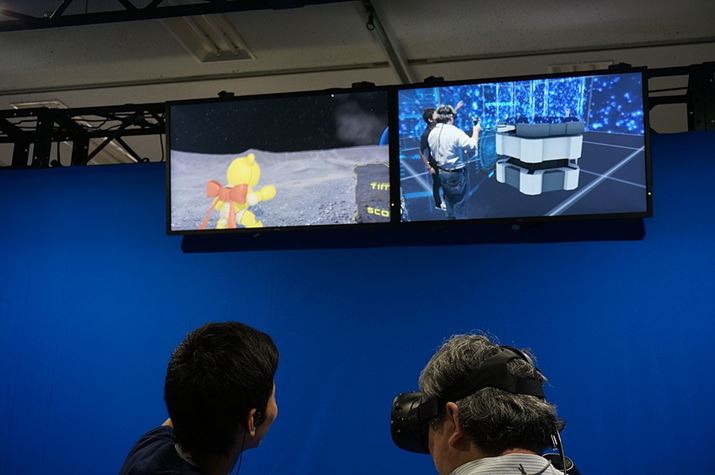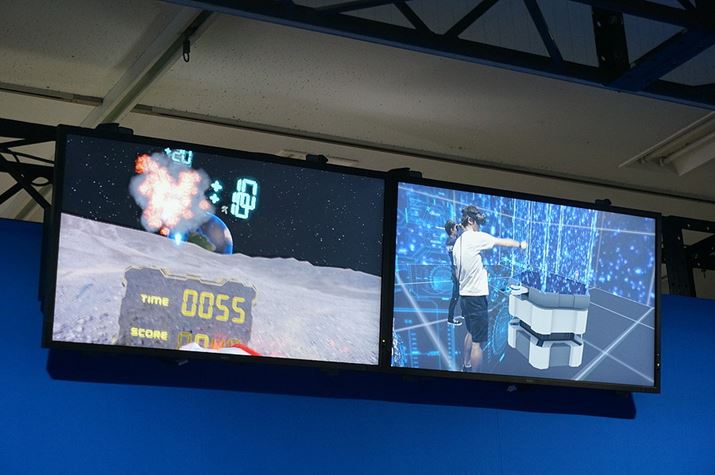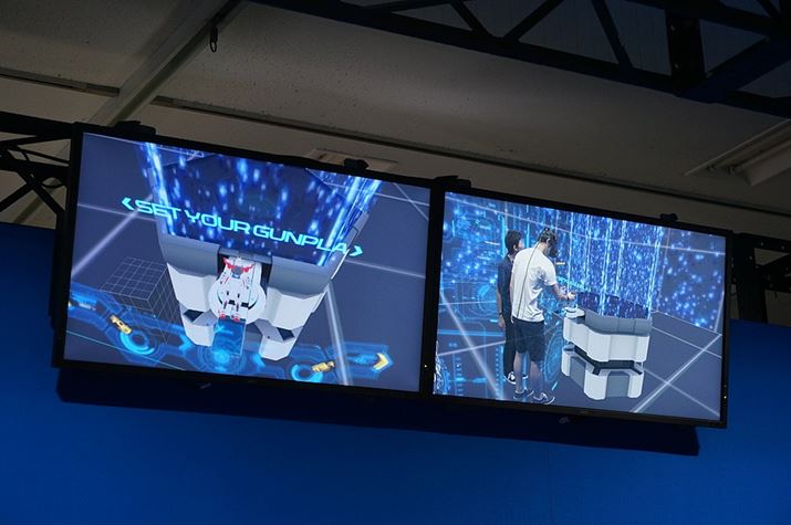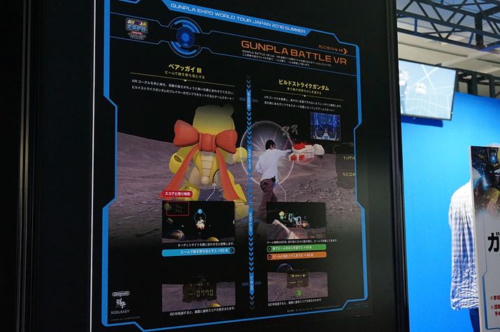 VRゴーグルとコントローラーを使って、VR空間でガンプラバトルを楽しめるゲームコンテンツです。2人協力プレイができ、プレイヤーは「ベアッガイV」か「ビルドストライクガンダム」を選んでプレイすることができます。VRゴーグルを装着して、ガンプラを手にしたら、<SET YOUR GUMPLA>の文字が。ビームで敵を打ち落としたり、敵の攻撃を拳でかわしたりします!