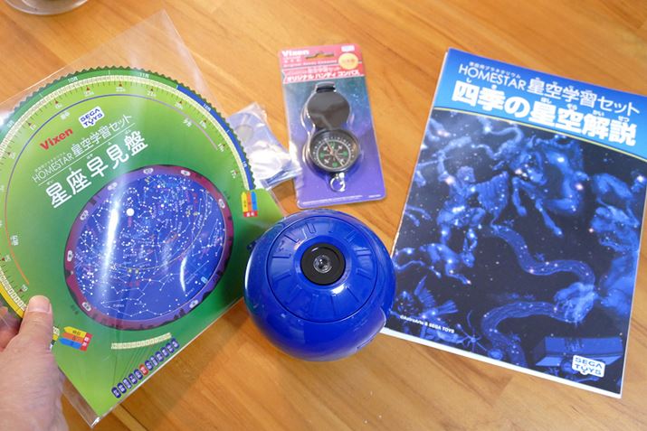 内容はHOMESTAR Lite2本体と式の星座原版フィルムが4枚に屋外で楽しむための星座早見表、ハンディコンパス、四季の星空解説が付いています