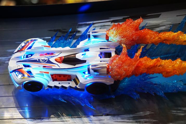 会場にあったコースで、組み立てたマシンを走らせてみた。ゲキドライヴのコースは1台ずつ決まったレーンを走るのではなく、フリーレーンでレースを行うのが特徴。そのため、ボディをぶつけ合いながらの競り合いや追い抜きなど、リアルなレースのようなシーンが見られる。