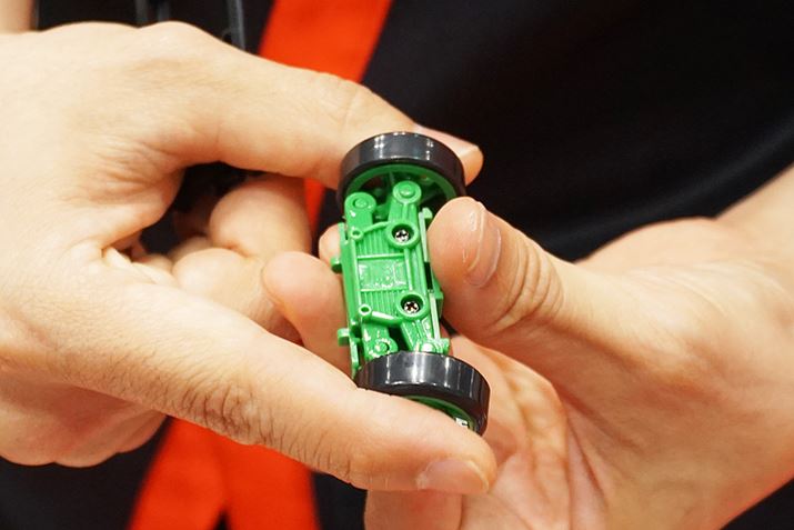 来場前から気になっていたのが、ドリフトしながら曲がれる小さなラジコンカー「ドリフトパッケージナノ」(タカラトミー)。本格的なドリフトラジコン「ドリフトパッケージ」を手がけるヨコモとの共同開発によって誕生した、手の平に乗る1/42の極小サイズながらも超リアルなドリフト走行ができる逸品だ。マンガ「イニシャルD」に登場するAE86やRX-7などの車種もラインアップされており、後輪をすべらせながら走行するさまは乗りモノ好きにはグッとくるポイント。