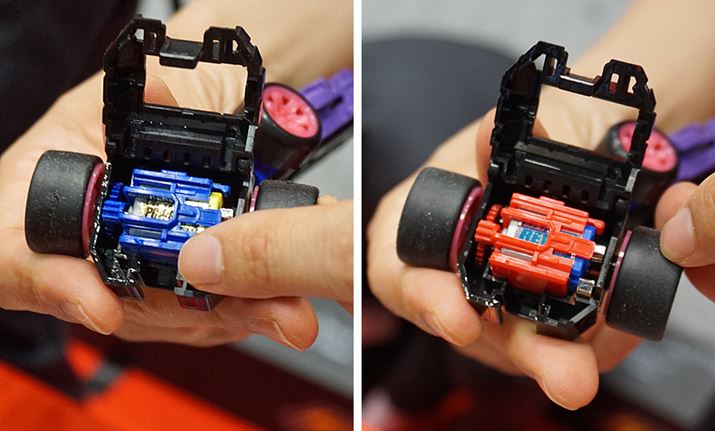 一番興味をひかれたのはリアユニット。スピード優先、バランス重視、パワー強化といったモーターとギアがあり、それらを組み合わせて作る。たとえば、「高速系ギア×バランス重視のモーター」(左)にすれば高速コース向けな走りとなり、「パワー系ギア×高速系モーター」(右)では両者の中間的な特性を目指せるといった具合だ