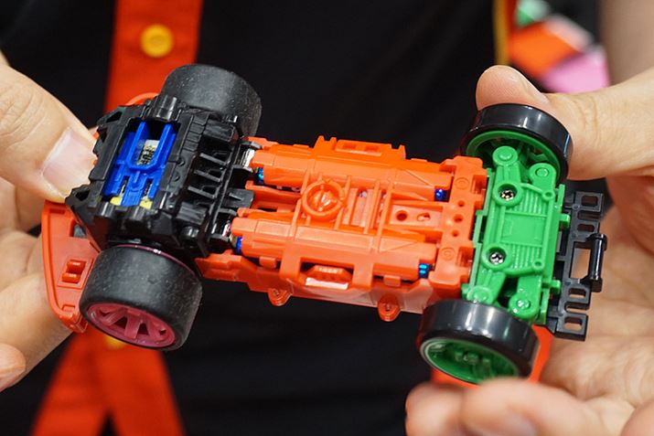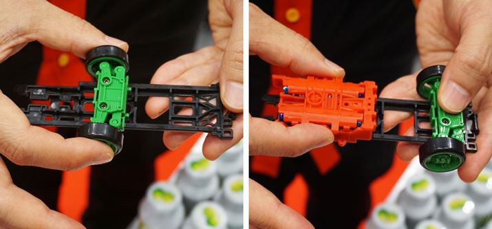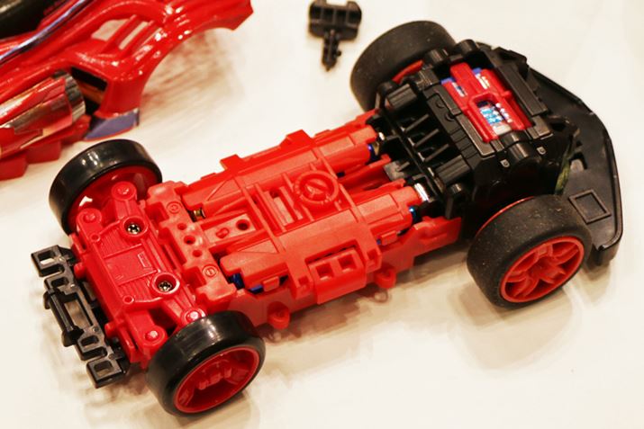 3つのユニットを差し込み、バンパー(赤いパーツ)を付ければシャーシが出来上がった。1分もかからず、カスタム完了。工具がいらないのもいい!