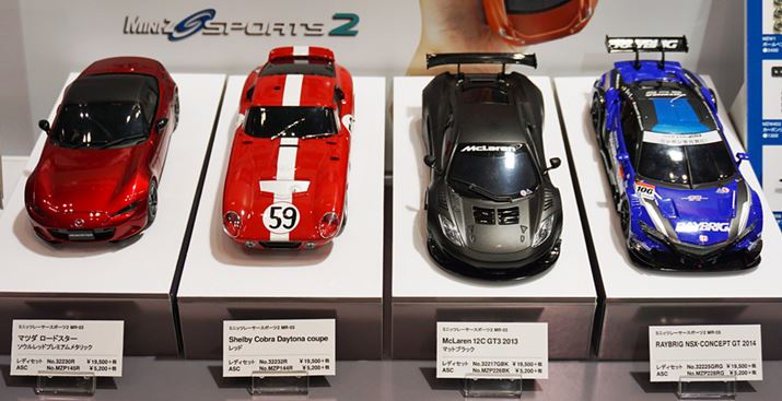 「マツダ ロードスター」「Shelby Cobra Daytona coupe」「McLaren 12C GT3 2013」「RAYBRIG NSX-CONCEPT GT 2014」といったレースシーンを賑わせたマシンが並ぶのは、グリップ走行向きの2WDモデル。価格は19,500円〜