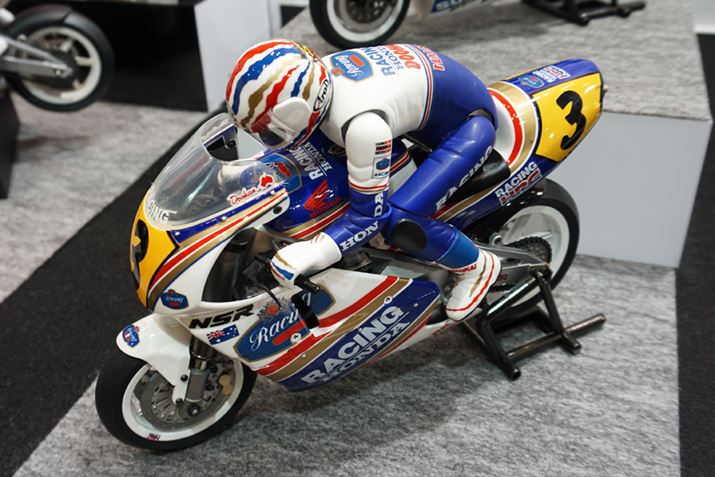 ドリフトとはまったく関係ないが、京商のブースでバイクのラジコンを発見! セミ・ダイレクト・ステアリング・システム(S.D.S.S.)を採用することで完全自立走行を実現した「ハングオンレーサー」シリーズだ。下の動画のように、バイクに乗っているライダーのフィギュアには13もの関節が設けられており、マシンが走行するだけでなく、曲がる際にはライダーがハングオンする。さらに、頭もイン側に向くようになっているのはすばらしい。ライダーと一体となって走る乗りモノであることを感じさせてくれる完成度だ。