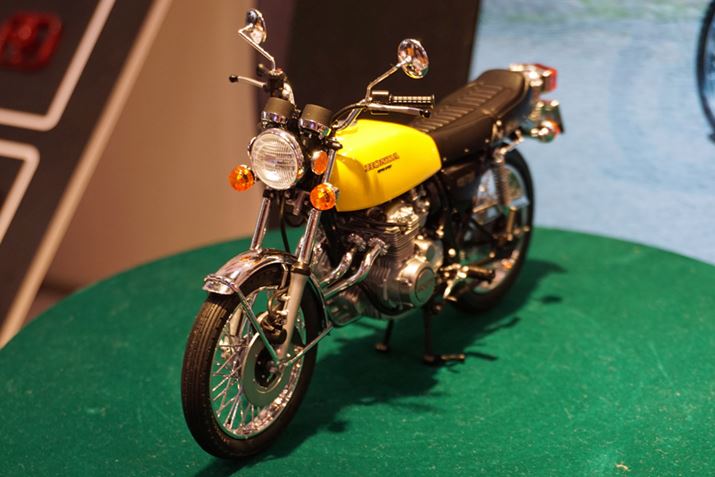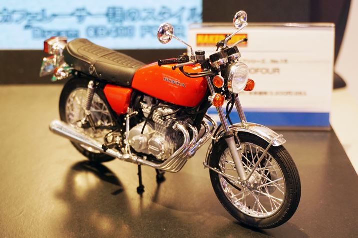 ブースに実車まで展示し、注目を集めていたのがアオシマのブースにある往年の名車、ホンダ「CB400Four」のプラモデル。「CB400 FOUR」の最初期型は現行の免許区分の導入前だったため、408ccという普通(中型)二輪免許では乗れない排気量だった。その後、免許制度に合わせて398ccモデルが追加されたのだ。両者には細かい違いがいくつかあるが、アオシマのプラモデルでは408ccバージョンと398ccバージョンの違いがしっかりと再現されている。