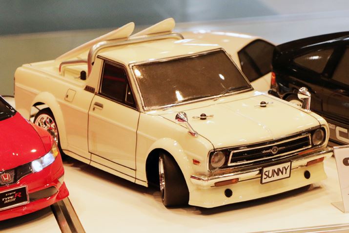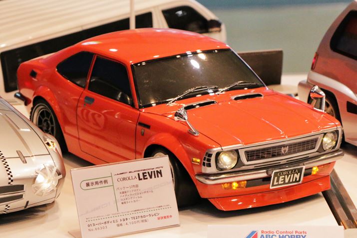 ラジコンカー用クリアボディの展示用作例がABCホビーに飾られていた。初期型TE27のトヨタ「カローラレビン」は、いつか筆者が乗りたいと憧れているクルマ