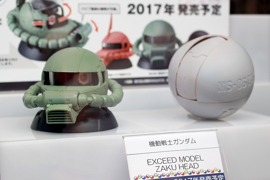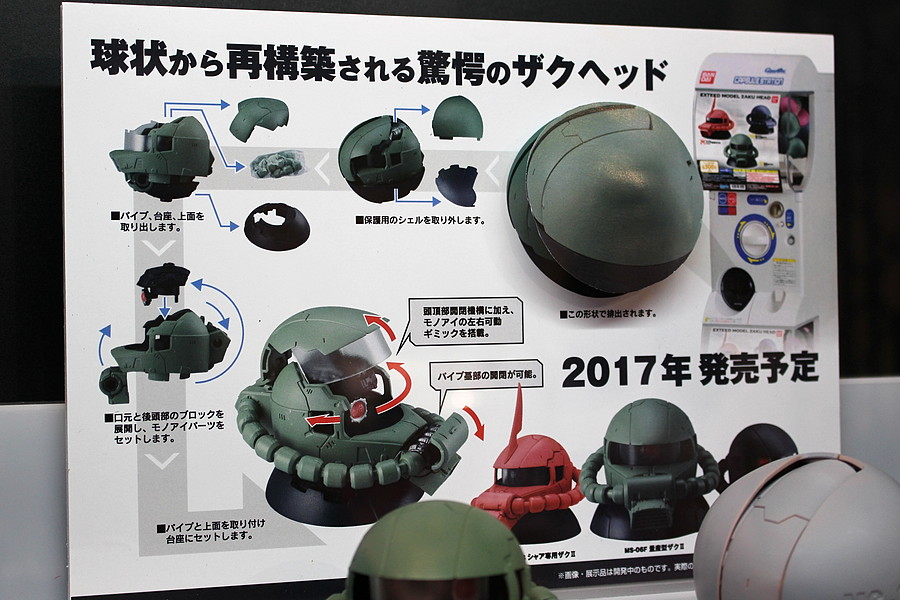 こちらは、2017年発売予定のガシャポン「EXCEED MODEL ZAKU HEAD」。1回500円です。写真の右側のように、丸い形でベンダーから出てきて、そのまま外側もザクヘッドのパーツになるそう