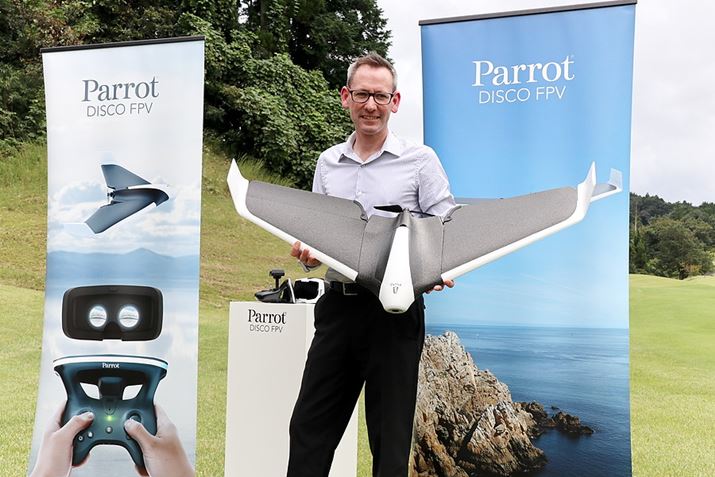 「Parrot Disco」を持つ、仏Parrot社のJPAC地域担当バイス・プレジデント兼マネージング・ディレクターのクリスさん。本体のサイズは58cm×115cmと、これまで発表されたドローンの中でも大型の部類ですが、EPP(発砲ポリエチレン)とカーボンチューブでできているので、重量は750gと軽量