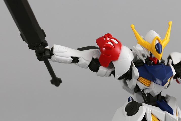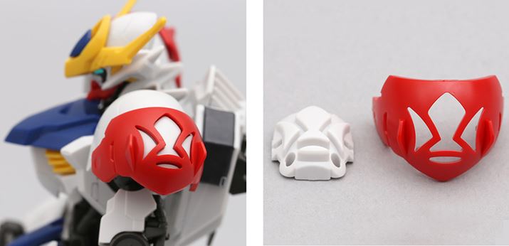 肩装甲パーツの赤い部分は引き出し式で可動します。それにより腕の可動域が拡大。腕を上げても肩が干渉しないので、写真のように腕を大きく振り上げるポーズもとらせることができます