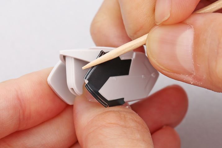 パーツ分割で補えない色分け部分、足の一部や、かかと、襟足、バックパックなどには、ホイールシールが付属しています。シールを折り曲げたり、パーツに密着させる際にはつまようじなどで軽くこすったりするときれいに貼ることができます。マーカーなどで塗り分けてもよいでしょう