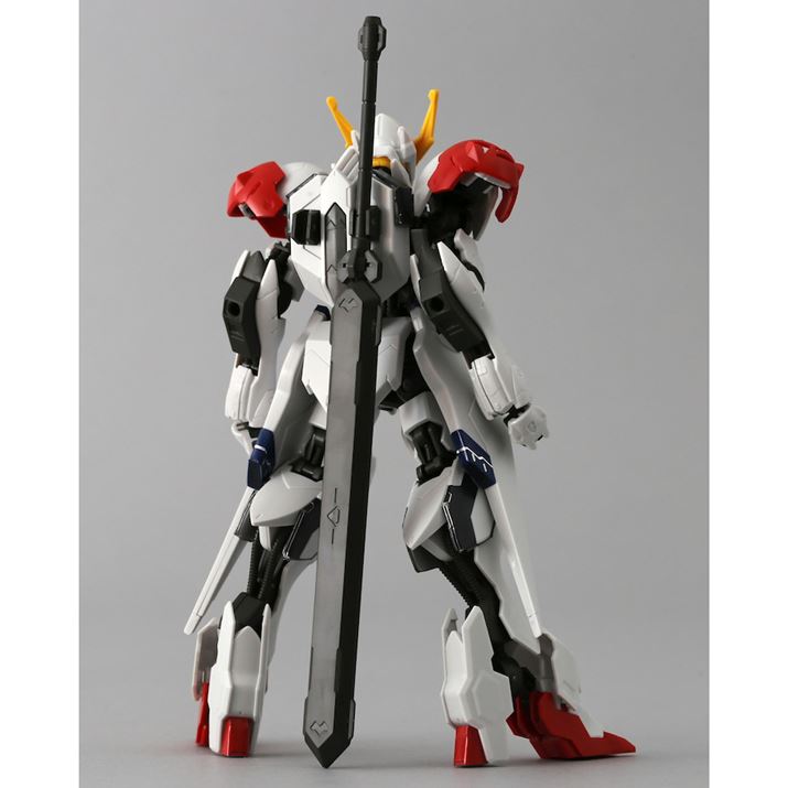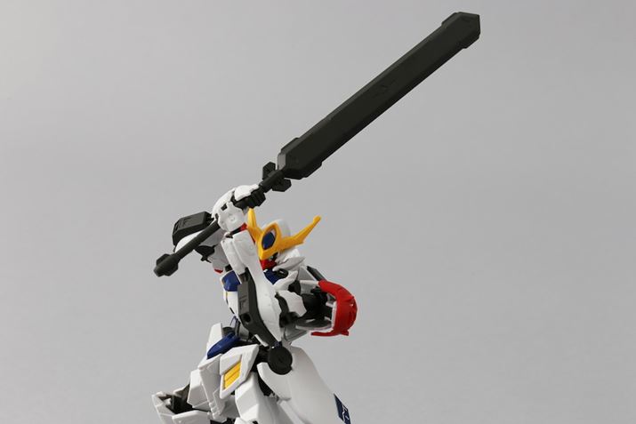後ろ姿です。かかとの赤い部分には色分け用のホイールシールが付属しています。背面には新しい武装として、ソードメイスを装着することが可能です。巨大なソードメイス、存在感がありますね