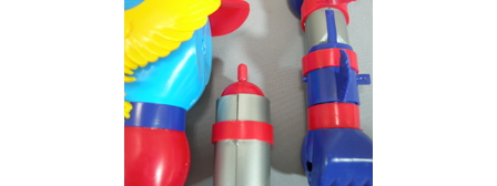 30年以上前の金型を使った復刻仕様なので、パーツを組み合わせても、うっすら隙間が空いていたり、うまく合わなかったりと、パーツの精度も当時のプラモデルそのまま。造形も、円筒形を繋げたような手足や、ボテッとした全体のスタイリングなど、どこか垢抜けないところがあるのですが、それがイイ感じの“味”になっています。完成すると、全高30センチ強で、なかなかの存在感を放ちます。飾ってみると、これまたダサカッコいいワケです(褒めてます)。