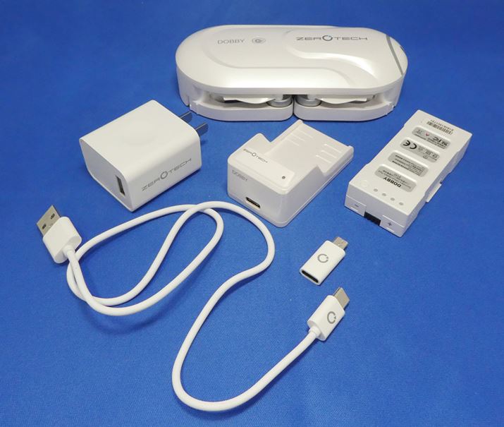 付属のバッテリー充電キットは、USB充電アダプターとUSBケーブルを組み合わせて使用する形となっている。DOBBY本体側充電端子は、専用設計のものではなく、これから普及が期待されるUSB Type-Cが使われており、USBケーブルで充電できるのもうれしい。おかげでモバイルバッテリーを使って充電することも可能なので、コンセントのない野外でも充電可能だ。大抵の大型ドローンだと、電圧の関係で仕方がないのだがバッテリーはコンセントで充電を行う。そのため野外でドローンを飛ばす場合、その場で充電できないので予備バッテリーがいくつも必要となってしまう。その点、DOBBYなら飛ばしている間や移動中でも予備バッテリーを充電できる。実際にフル充電には数時間はかかるので、メリットは少ないかも知れないが、いざ充電したいと思った時には大いに助かる。
