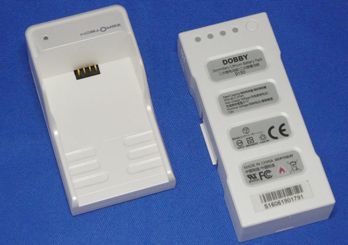 ドローンを飛ばす際に重要になってくるのがバッテリーの持続時間だが、DOBBYはカタログスペックで約9分となっている。実際に飛ばしてもそのくらいなのだが、なんだかんだといって飛ばして楽しんでいるとアッという間にバッテリー切れとなるので、バッテリー1本では少々物足りなさを感じる。DOBBYを本気で使い倒したいなら、予備バッテリーは必須で、2〜3本は用意しておきたいところだ。
