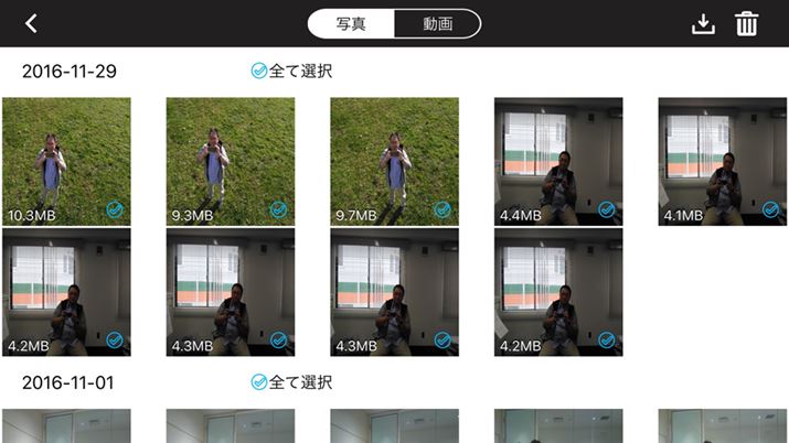DOBBYで撮った動画や写真は本体のSSDに保存される。必要な動画や写真は、アプリのギャラリー画面からタップで選んでスマホにダウンロードする形だ
