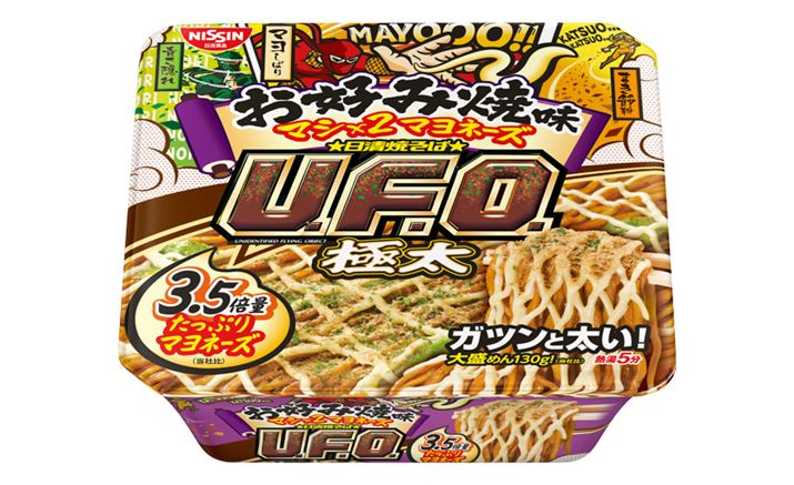 何でもマヨネーズをかけて食べなきゃ気がすまない「マヨラー」は必見。日清食品が発売する「日清焼そば U.F.O.極太 お好み焼味マシ×2 マヨネーズ」は、従来の3.5倍にあたるU.F.O.史上最大量のマヨネーズをトッピングして楽しむカップ焼きそば。濃厚な甘口ソースは、香味野菜とラードの旨みに、豚肉やキャベツを炒めた風味が加わり、まるで鉄板で焼いたような香ばしさを再現。仕上げに、かつお節粉とあおさをミックスしたふりかけをかければ、こってり濃厚なお好み焼き味の焼きそばの完成です。