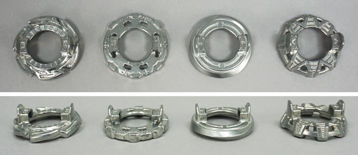 ベイの一番上のパーツ「レイヤー」の形状はさまざまで、刃を飛び出すように配置した攻撃性の高いものや、逆に攻撃を受け止めて守りを強くしたものなど多様なバリエーションがそろっています