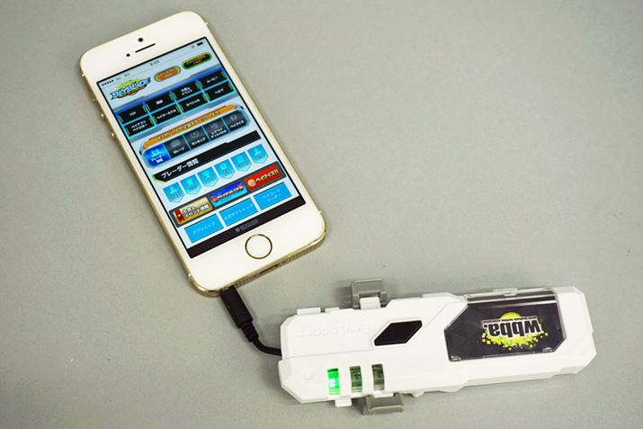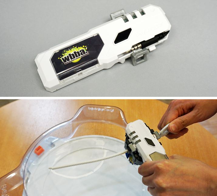 ベイロガーをランチャーに装着し、グリップのようにしてプレイすることも可能。ランチャーの回転から直接データを取っているので、ベイロガーを外すとデータの記録はできません