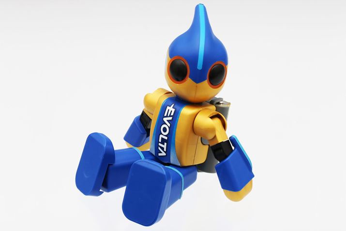 プラエボルタくんの出来上がりです。実物と同サイズなので、実際のエボルタのイメージもつかみやすいですね。頭とひざのラインはシールで色分け。胸のEVOLTAロゴが印象的です