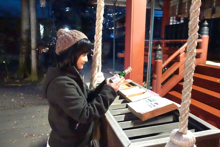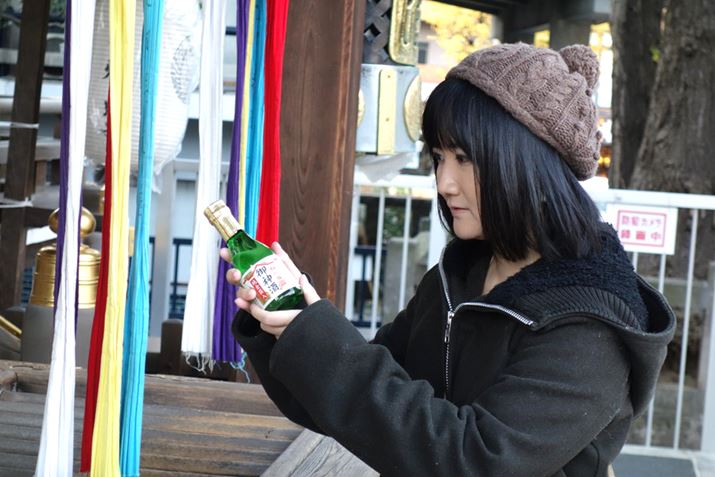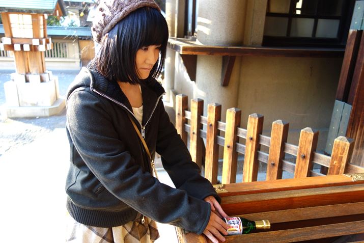 手水で身を清め、お参りをし、カバンから御神酒(おみき)を取り出した。お供えするために事前に買っておいたのである。東郷神社の人に聞いたところ、御神酒をお供えしたい場合は、お賽銭箱の上に置いておけばいいらしい。