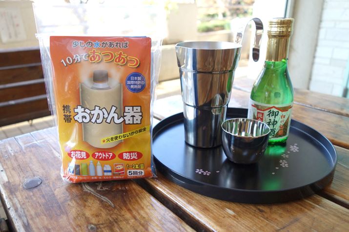 火を使わずに外で飲み物を温めることのできる「携帯おかん器」を使い、熱燗を作る。袋状の「おかん器」に、付属の発熱剤を入れ、水をそそぐ。すると、すぐにぶくぶくと沸騰し始めた。そこに御神酒を入れ、しばらく待つ。