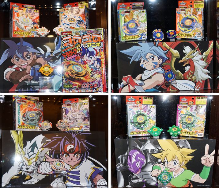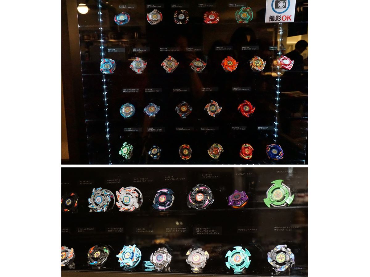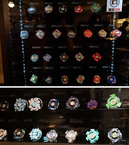 入店して最初に目に留まったのは、大きな棚。テレビアニメ「爆転シュート ベイブレード」のキャラクターたちが使っていたベイブレードが展示されています