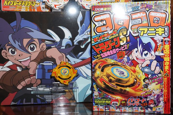 ちなみに、「ドラグーン」の金色のベイは、「月刊コロコロコミック」の大人版「コロコロアニキ」第7号の応募者全員サービスでゲットできる「ドラグーンストームゴールドVer」です