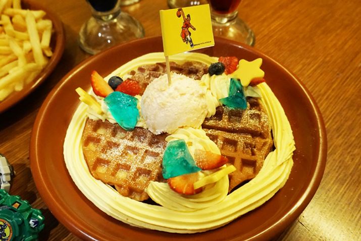 デザートは防御型ベイブレード「ドライピオ」からイメージ。ワッフルにマンゴークリームとアイス、そしていちごがトッピングされています。「ドライピイオワッフル 〜エディ添え〜」は980円(税込)