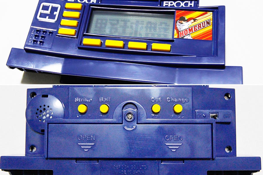 電光掲示板の音声は黄色いボタンで手動操作。前面のボタンを押せば、「ホームラン」など攻撃側の音声が、背面のボタンを押せば「ストライク」など守備側の音声が鳴ります