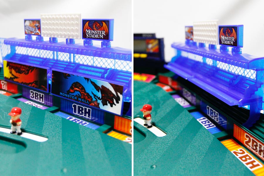 1時間近く試行錯誤しながらようやく球場が完成しました! ホームからセンターまで55cm、両翼45cmというなかなか立派な球場です(史上最大級)。電光掲示板も完備。アウントカウントや得点など、さまざまな表示が出るだけでなく、「プレイボール」などの音声も流れます。これはかなりテンションが上がります! 外野スタンドにはボストン・レッドソックスの本拠地フェンウェイ・パークの“グリーンモンスター”を思わせる巨大なフェンス“モンスターフェンス”が。開閉式で、閉めればフェンスとなって当たった打球はヒットになり、開ければ打球がスタンドインするという仕組みです。この開閉が勝負の行方を左右しそうですね! ほかにも外野手の守備位置を変えられたりとなかなかの進化ぶりです。