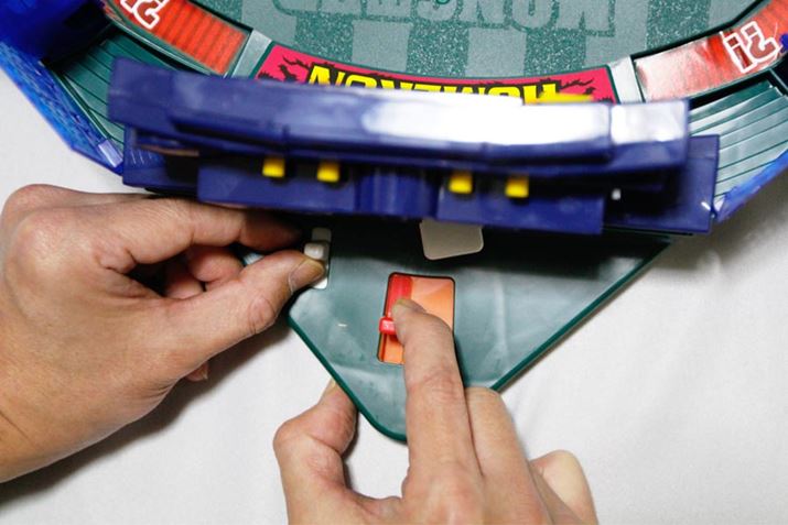 さて、それではプレイしてみましょう! レバーを引いて離すことで打者がスイングすることや、同じくレバー操作で投球するというのは従来どおり。しかし、この野球盤ではボールが地面を転がるだけでなく、空中を飛ぶ投球(3Dピッチング)もできるのです! 従来の転がる投球に加えて飛ぶ投球、もちろん消える魔球も健在なので、多彩なピッチングが可能です。