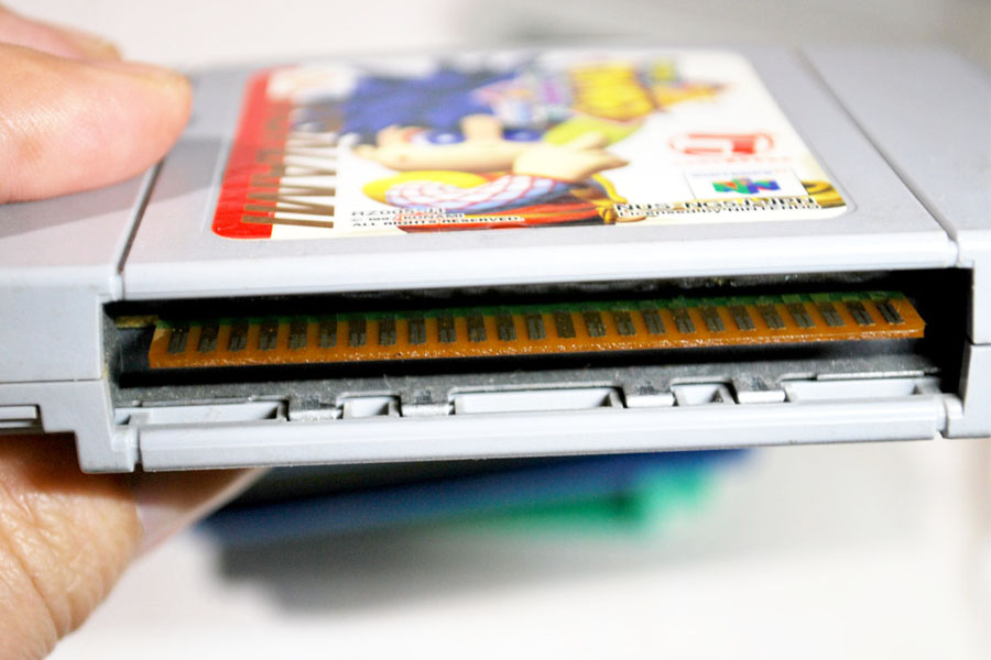 ゲームがうまく起動しないのは、だいたいがカセットと本体の挿し込み端子の接触不良です。とくに30年以上とか、長い年月が経過しているファミコンのカセットは端子もかなり汚れているでしょうし、あるいは摩擦で端子部が摩耗しているかもしれません。