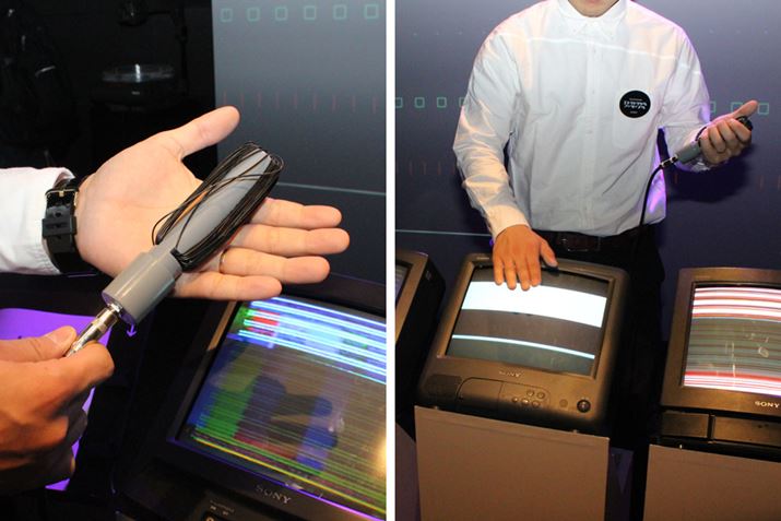 スカイセンサーは、実際に受信した電波を音に変えて近くのスピーカーから慣らす仕組み。今回のイベントでは、一緒にテレビのリモコンやカメラのフラッシュが用意されており、リモコンを押したときやフラッシュを焚いたときに発生する微量な電磁波をキャッチしてその場で音を鳴らすことができる。