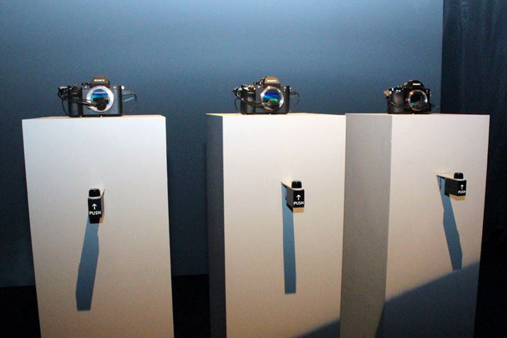 3種類のαは、ボタンを押すことでシャッター音を鳴らせる仕組み。実際にカメラのシャッターが閉じて、アコースティックな音が鳴る。実際に試してみると、シリーズによって実はシャッター音が異なっていたことに気付いておもしろい。