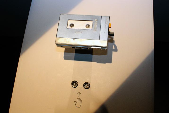 初代ウォークマンは、来場者がウォークマンの下にあるセンサーに手をかざすと、テープ部に収録されているサンプリング音が流れる。手の距離で音程を変化させるというもので、演奏中の様子はテルミンのようだ。