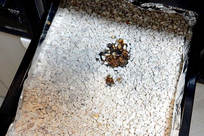 気になるお手入れ方法ですが、油が垂れた部分はスプーンで取り除き、石がうっすら黒くなっているところはそのままでいいそうです。次回以降はかき混ぜながら使っていき、全体が黒くなったら取り換え時。不燃ごみで処理をします。